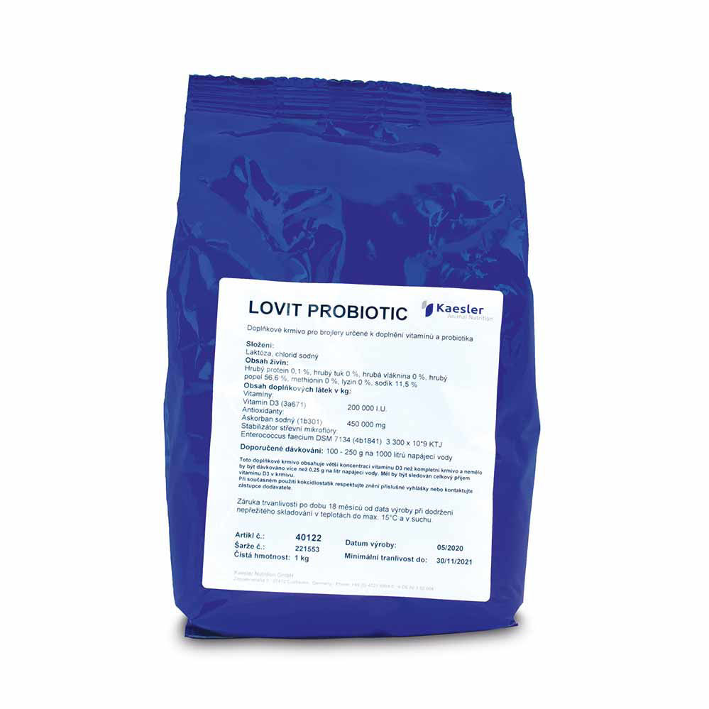 Lovit Probiotic je formulacija probiotika in dveh vitaminov, ki je zasnovana za dodatno, kratkotrajno dopolnjevanje s pitno vodo. Vsebuje žive mlečnokislinske bakterije (Enterococcus faecium), ki podpirajo razvoj zdrave črevesne mikroflore in zavirajo kolonizacijo potencialno patogenih klic. Na ta način se poveča zmogljivost črevesne flore. Vitamina D3 in C podpirata metabolizem in krepita imunski sistem telesa. Lovit Probiotic blaži negativne vplive stresa in neugodnih okoljskih razmer ter tako prispeva k zagotavljanju visoke učinkovitosti.