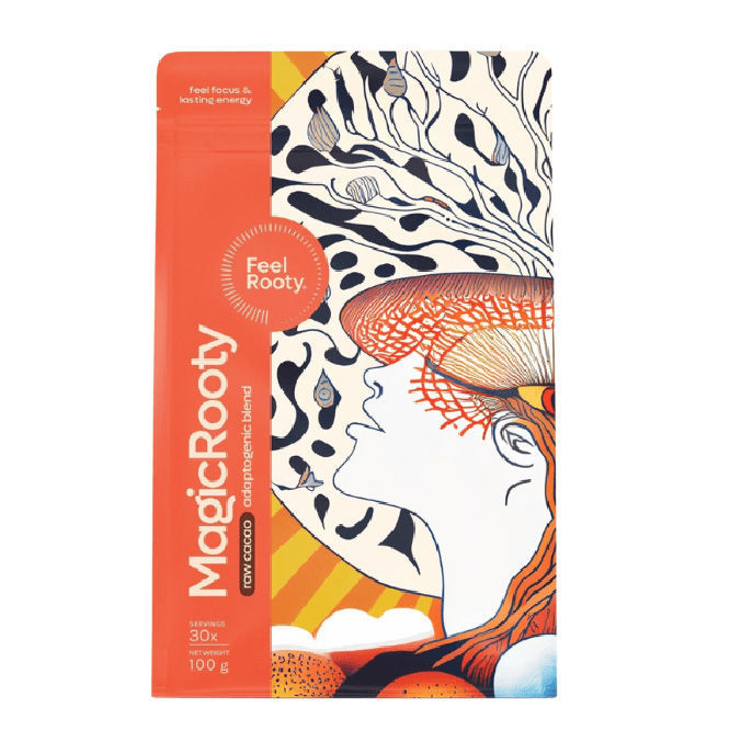 MagicRooty je naravni napitek, zasnovan kot alternativa kavi, ki združuje okus kakava z adaptogenimi zelišči in medicinskimi gobami. Med ključnimi sestavinami so resasti bradovec, rožni koren, kordiceps, yerba mate, maca, alpinia galanga, kakav in vitamin B12. MagicRooty je primeren za vse, ki iščejo naravno podporo za povečanje produktivnosti, zbistritev misli in pomoč pri obvladovanju stresa. Izdelek je veganski, brez glutena ter brez dodanih sladkorjev ali sladil. Priprava je preprosta.
