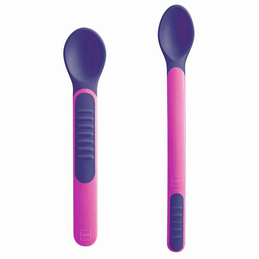 Mam set mehkih žličk z zaščitnim pokrovom vsebuje kar dve žlički, ki sta povsem primerni za majhna otroška usta. Staršem uporabo in hranjenje močno olajša tudi na toploto občutljiva konica. Ta namreč hitro spremeni barvo, če je hrana prevroča.
