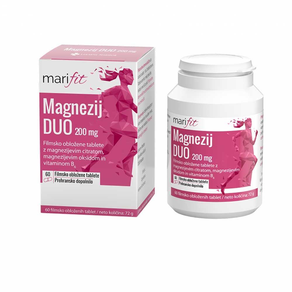 Marifit Magnezij DUO 200 mg je inovativno prehransko dopolnilo, katerega osnova je magnezij v obliki magnezijevega citrata ter tdi v obiki magnezijevega oksida. Prehranski dodatek vsebuje tudi dodan B6 vitamin.