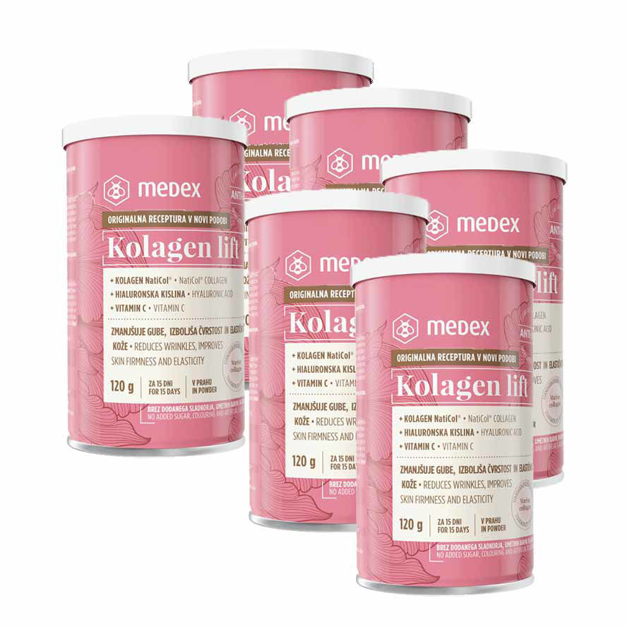 Kolagen je pravzaprav beljakovina, ki je najbolj zastopana v našem telesu. Gre za strukturni protein, ki ima funkcijo oblike ter opore. Je izredno pomemben gradnik sklepnega hrustanca, kože, nohtov in tudi las. V kombinaciji upadanja kolagena ter upadanja hialuronske kisline, pride do upadle in izsušene kože. Medex Kolagenlift v prahu pa vsebuje prav obe te sestavini.