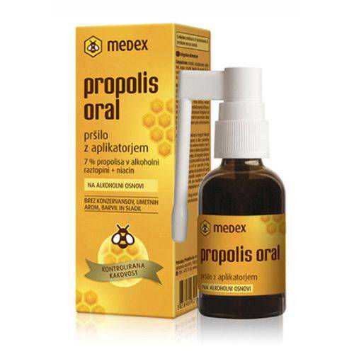 Medex Propolis Oral pršilo na alkoholni osnovi je naravni čebelji pridelek za nego in zaščito ust in ustne sluznice. S 7% vsebnostjo propolisa, bioflavonoidov in niacina, blagodejno deluje na počutje v naših ustih in pripomore k blaženju neprijetnih občutkov in zadaha. Izdelek Medex Propolis pršilo na alkoholni naslovi je naraven slovenski izdelek kontrolirane kakovosti in ne vsebuje kozervansov, umetnih barvil ter arom.