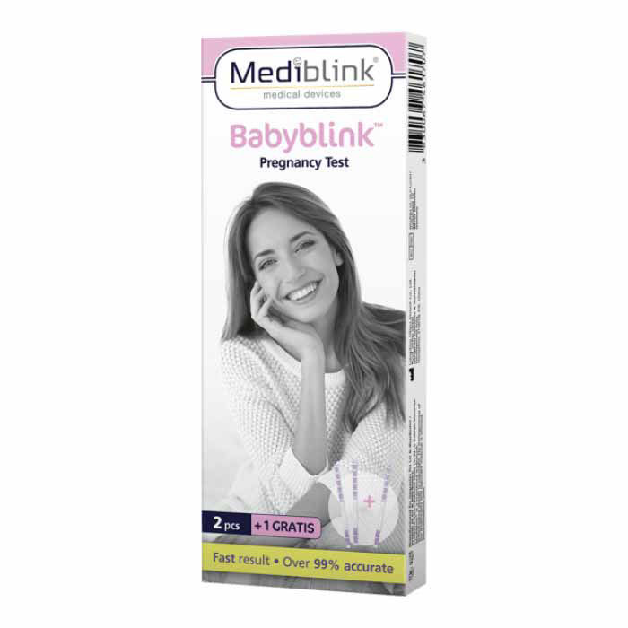 Mediblink Babyblink M155 test nosečnosti prev erja vsebnost hormona hCG v človeškem urinu. V primeru ugnezditve oplojenega jajčeca se vrednost hCG iz dneva v dan povišuje.