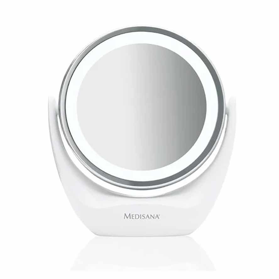 Medisana CM 835 stoječe kozmetično ogledalo 2v1 navdušuje s svojo inovativno ter kakovostno izdelavo v modernem dizajnu. Zahvaljujoč enotni obročasti osvetlitvi iz 12 energijsko varčnih belih LED luči, lahko poskrbite za svoj obraz z optimalno vidljivostjo. LED diode ne navdušujejo le z varčnostjo, temveč tudi z dolgo življenjsko dobo in svetilnostjo. Medisana CM 835 stoječe kozmetično ogledalo 2v1 je ustvarjeno s visokokakovostnim kromiranim premazom in trdno podlago ter vključuje 3 baterije AAA.