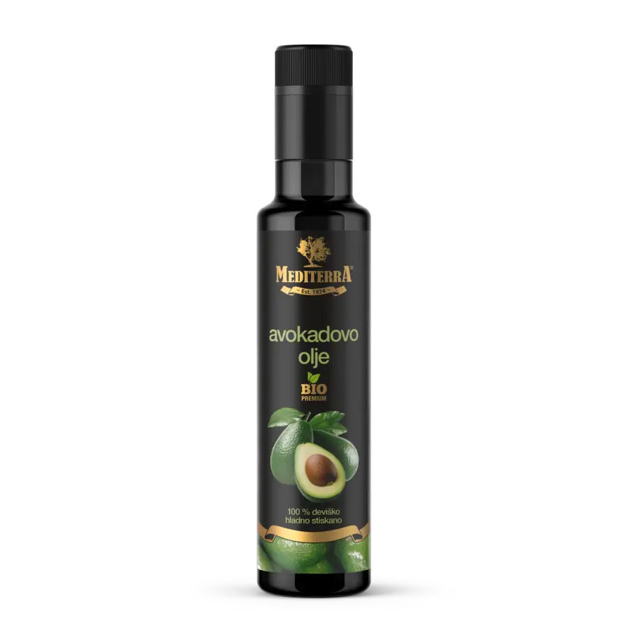 Mediterra Bio Premium deviško in hladno stiskano avokadovo olje najvišje možne kakovosti je pridobljeno zgolj z mehanskimi postopki in sicer s hladnim stiskanjem neposredno iz najboljše pulpe izbranih surovih plodov avokada (Persea americana) iz ekološke pridelave. Odlikuje ga visoka vsebnost nenasičenih maščob. Nadomestitev nasičenih maščob z nenasičenimi maščobami v prehrani prispeva k vzdrževanju normalne ravni holesterola v krvi. Mediterra Bio Premium deviško in hladno stiskano avokadovo olje ima pridobljene certifikate BIO, VEGAN in HACCP, ki potrjujejo kakovost na najvišji ravni. Je 100 % naravno in brez umetnih ali kakršnih koli dodatkov.