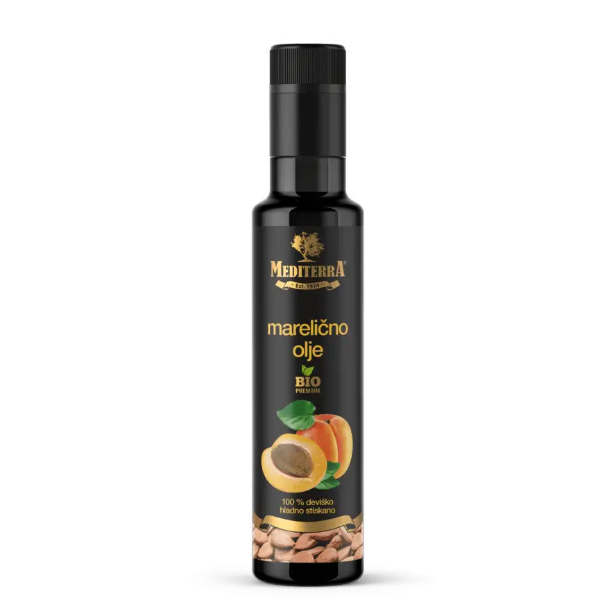 Mediterra Bio Premium deviško in hladno stiskano marelično olje najvišje možne kakovosti je pridobljeno zgolj z mehanskimi postopki in sicer s hladnim stiskanjem neposredno iz najboljših izbranih surovih jedrc marelice (Prunus armeniaca) iz ekološke pridelave. Odlikuje ga visoka vsebnost nenasičenih maščob. Nadomestitev nasičenih maščob z nenasičenimi maščobami v prehrani prispeva k vzdrževanju normalne ravni holesterola v krvi. Mediterra Bio Premium deviško in hladno stiskano marelično olje ima pridobljene certifikate BIO, VEGAN in HACCP, ki potrjujejo kakovost na najvišji ravni. Je 100 % naravno in brez umetnih ali kakršnih koli dodatkov.