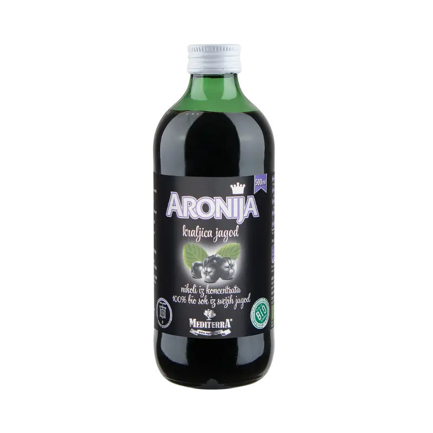 Mediterra Bio Premium naravni sok aronije je hladno stiskan sok, direktno pridobljeno iz svežih jagod aronije (Aronia melanocarpa) najvišje možne kakovosti. Mediterra Bio Premium naravni sok aronije je pridobljen z mehanskimi postopki in sicer s hladnim stiskanjem neposredno iz najboljših izbranih surovih svežih jagod aronije (Aronia melanocarpa) iz ekološke pridelave. Odlikuje ga visoka vsebnost ORAC in OPC vrednosti. Jagode aronije dajejo neprimerno večjo antioksidativno zaščito kot borovnice, brusnice ali granatno jabolko. Mediterra Bio Premium naravni sok aronije ima pridobljene certifikate BIO, VEGAN in HACCP, ki potrjujejo kakovost na najvišji ravni.