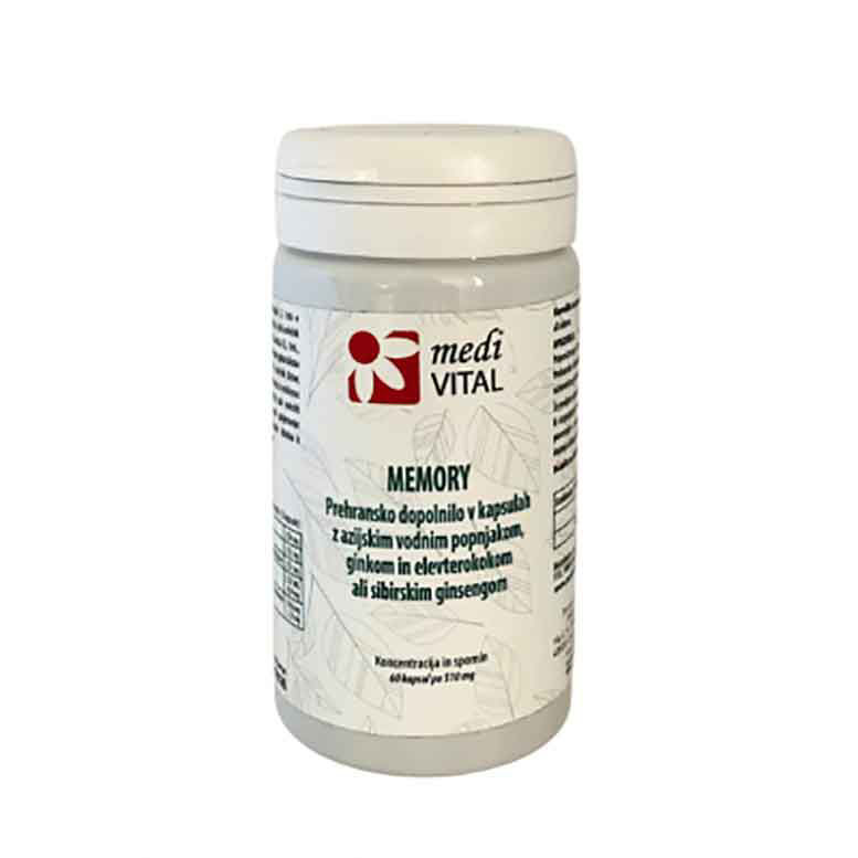 MediVital Memory prehransko dopolnilo v kapsulah, vsebuje azijski vodni popanjek, ginko in ginseng ter elevterokok. Primerno za vse, ki bi želeli vplivati na svoj spomin ter koncentracijo.