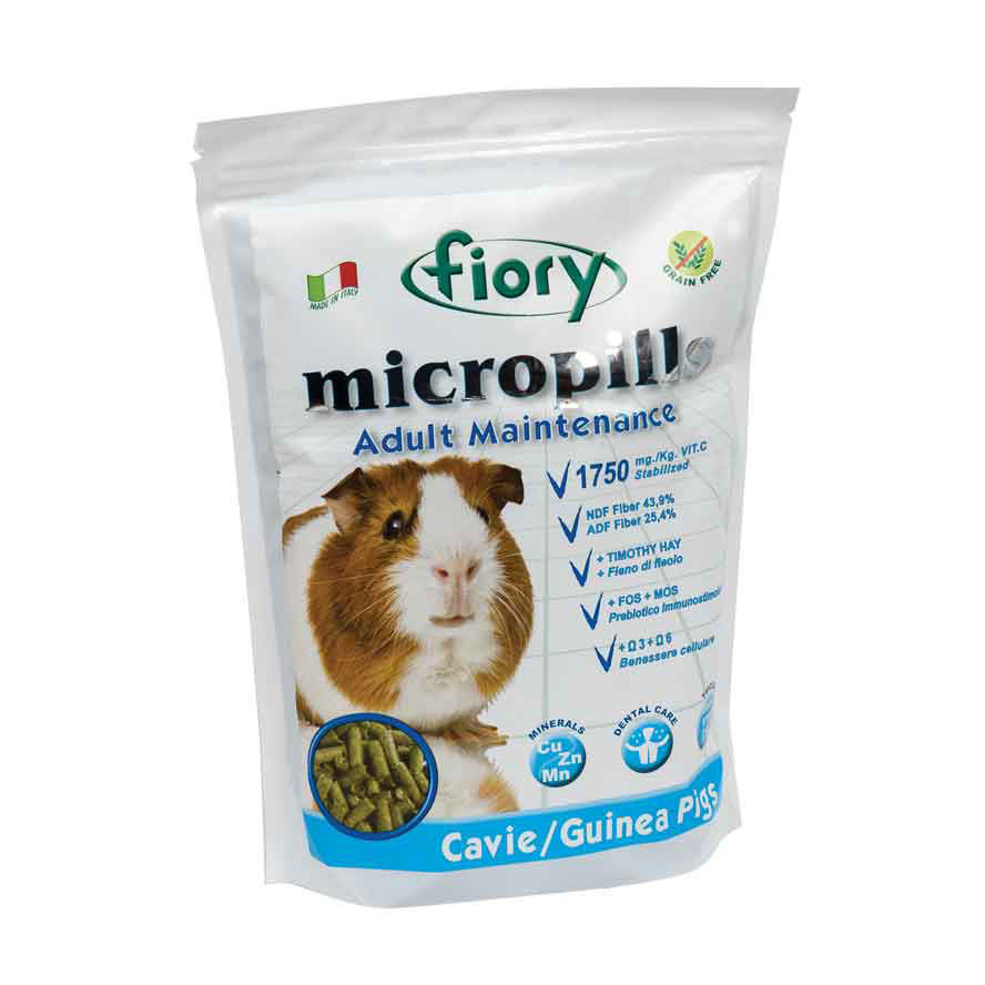 Briketi za odrasle morske prašičke so obogateni s silikatnim peskom, ki odlično deluje za zobe vašega ljubljenčka. V hrani je dodan vitamin C, prisotnih pa je tudi veliko drugih vitaminov in mineralov. Posebno vlogo ima tudi dodana maščobna kislina, tako omega 3 kot omega 6. Micropills hrana brez žit za odrasle morske prašičke pa je obogatena tudi z beta glukani in Juko.