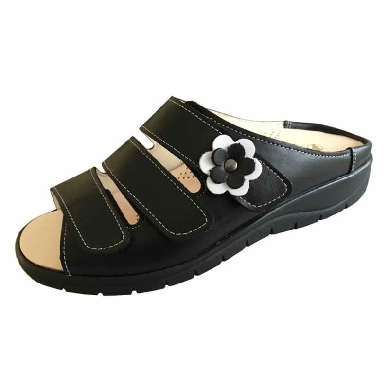 Migi obutev Maja je črn model z belo rožico, ki je narejena iz naravnega govejega usnja.