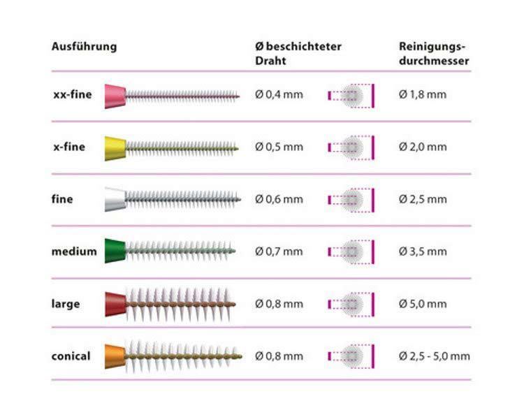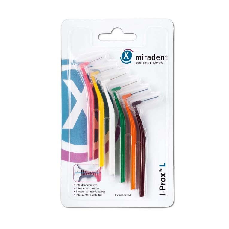 Medzobne ščetke Miradent I-Prox L so različnih velikosti - manjše so namenjene čiščenju in odstranjevanju nečistoč med zobmi, medtem ko so medzobne ščetke, ki so večje primerne bolj za čiščenje zobnih aparatov, implantatov, mostičkov, breketov in podobno. Visoka kakovost ščetin ne rani dlesni.
