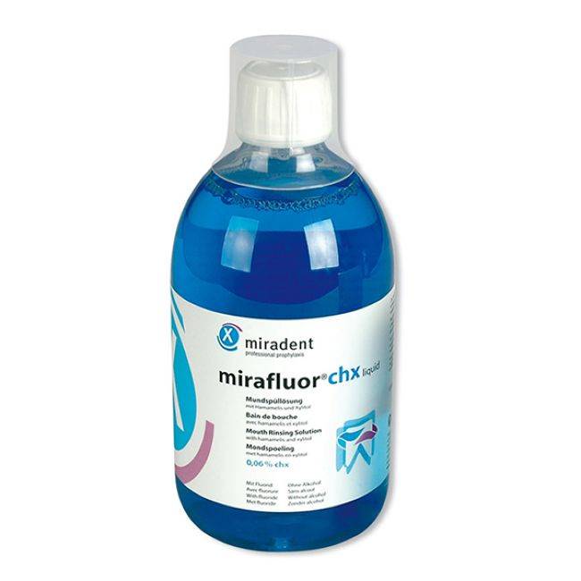 Miradent Mirafluor Chx regenerativna ustna voda je obogatena s hamamelisom, kloroheksidinom, fluoridom in ksilitolom ter ne vsebuje alkohola.