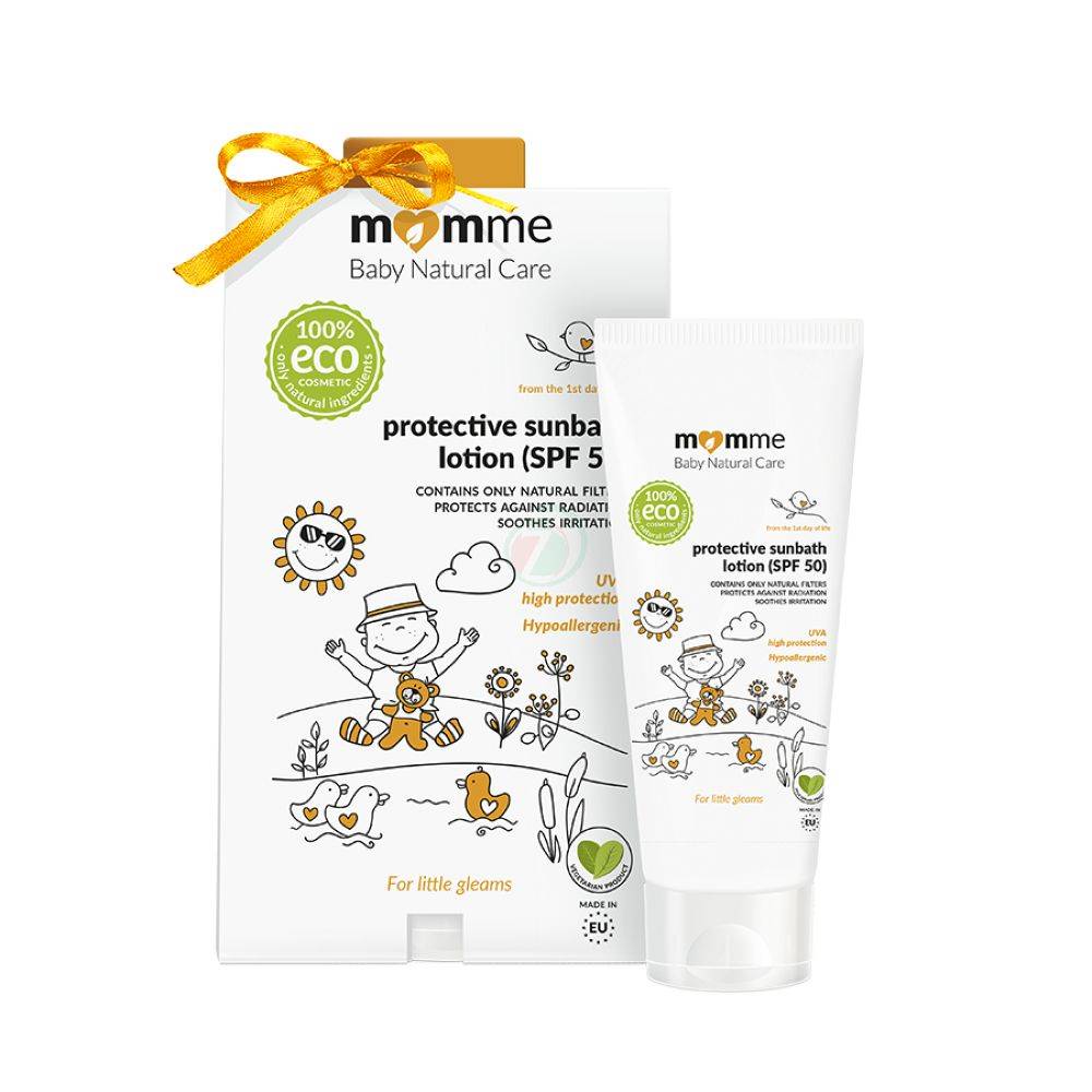 Izpostavljenost soncu je z MomMe losjonom za sončenje signifikantno manjša. Izdelek vsebuje betain, ki se ga pridobiva iz rastlinskih ekstraktov; mandljevo olje je dodano z namenom zmanjšanega odvajanja dermalne vlage. Glicerin, ki ga zaščitni losjon vsebuje kožo intenzivno vlaži ter daje prijeten občutek. Koža je intenzivno navlažena ter okrepljena naravni vitamin E in bisabolol, ki je pridobljen iz kamilice delujeta intenzivno regenerativno.