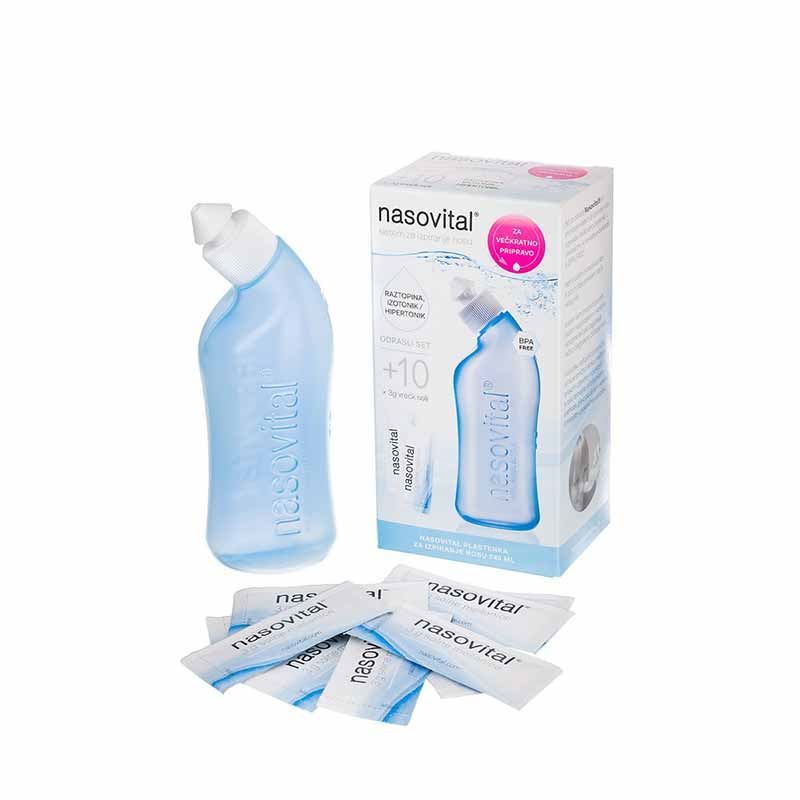 Nasovital sistem za izpiranje nosu nudi učinkovito in enostavno čiščenje dihalnih poti ter izločanje sluzi, ki je morebiti gosta ter lepljiva ter onemogoča normalno dihanje.