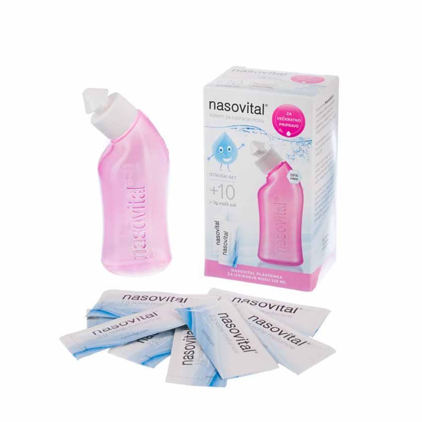Nasovital sistem za otroke je sestavljen tako, da lahko za izpiranje uporabimo ustrezne količine raztopine - zato so tudi priložene plastenke primerne za otroški nosek (1x1 deciliter)