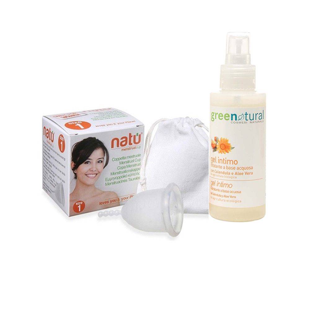 Natu menstrualna skodelica + Natu lubrikant je priročen higienični set za nego intimnega področja, še posebej med menstrualnimi težavami 1x mesečno.