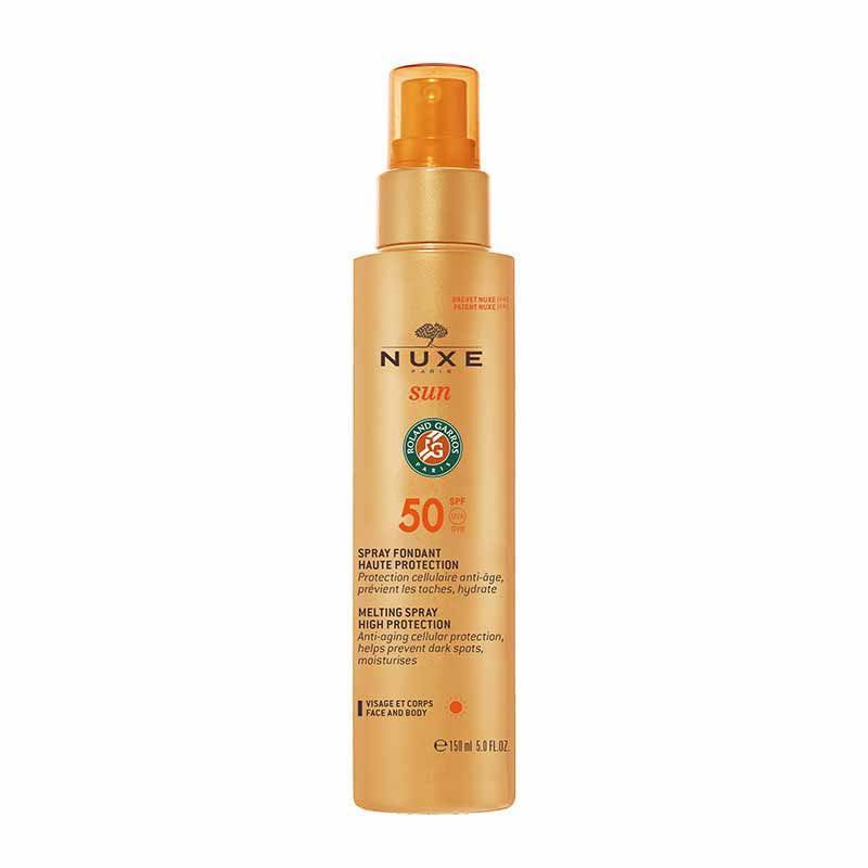 Nuxe Sun topljivo razpršilo za obraz in telo je primerno za zaščito pred soncem in ob enem zagotavlja enakomerno porjavelost in UVA in UVB zaščito na popolnoma mineralni osnovi. Kozmetičen izdelek kožo intenzivno zaščiti, ji nudi hidracijo, preprečuje nastajanje pigmentnih madežev in prezgodnje staranje kože obraza in telesa.