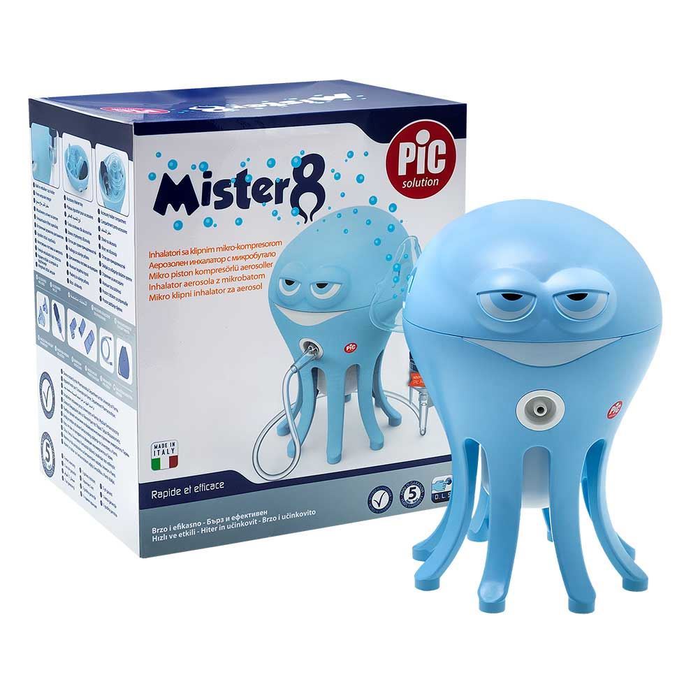 PiC Mister8 otroški inhalator je medicinska naprava tipa IIa, ki pretvori zdravilo iz tekoče oblike v aerosolno razpršilo, le-tega pa razpršimo naravnost v respiratorni trakt (dihalno pot). S pomočjo posebno oblikovane posodice za zdravila, zdravilo zahvaljujoč optimalni velikosti aerosolnih delcev lažje prodre v respiratorni trakt. Stranski pretok opazno poveča tok delcev in skrajša terapijo, kar pomembno vpliva na učinkovitost in sprejemljivost terapije, predvsem pri otrocih.