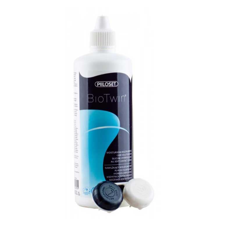 Piiloset BioTwin je večnamenska raztopina za nego mehkih kontaktnih leč v kompletu s posodico za sharnjevanje leč: