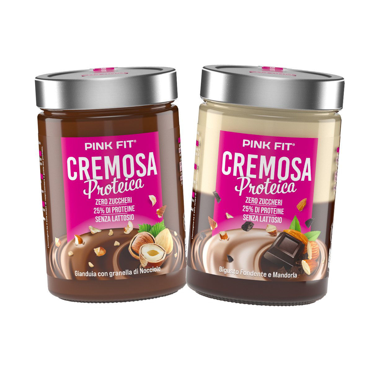 Pink Fit Cremosa je lešnikova in kakavova krema, narejena na osnovi sirotkinih beljakovin (26%), s sesekljanimi lešniki.