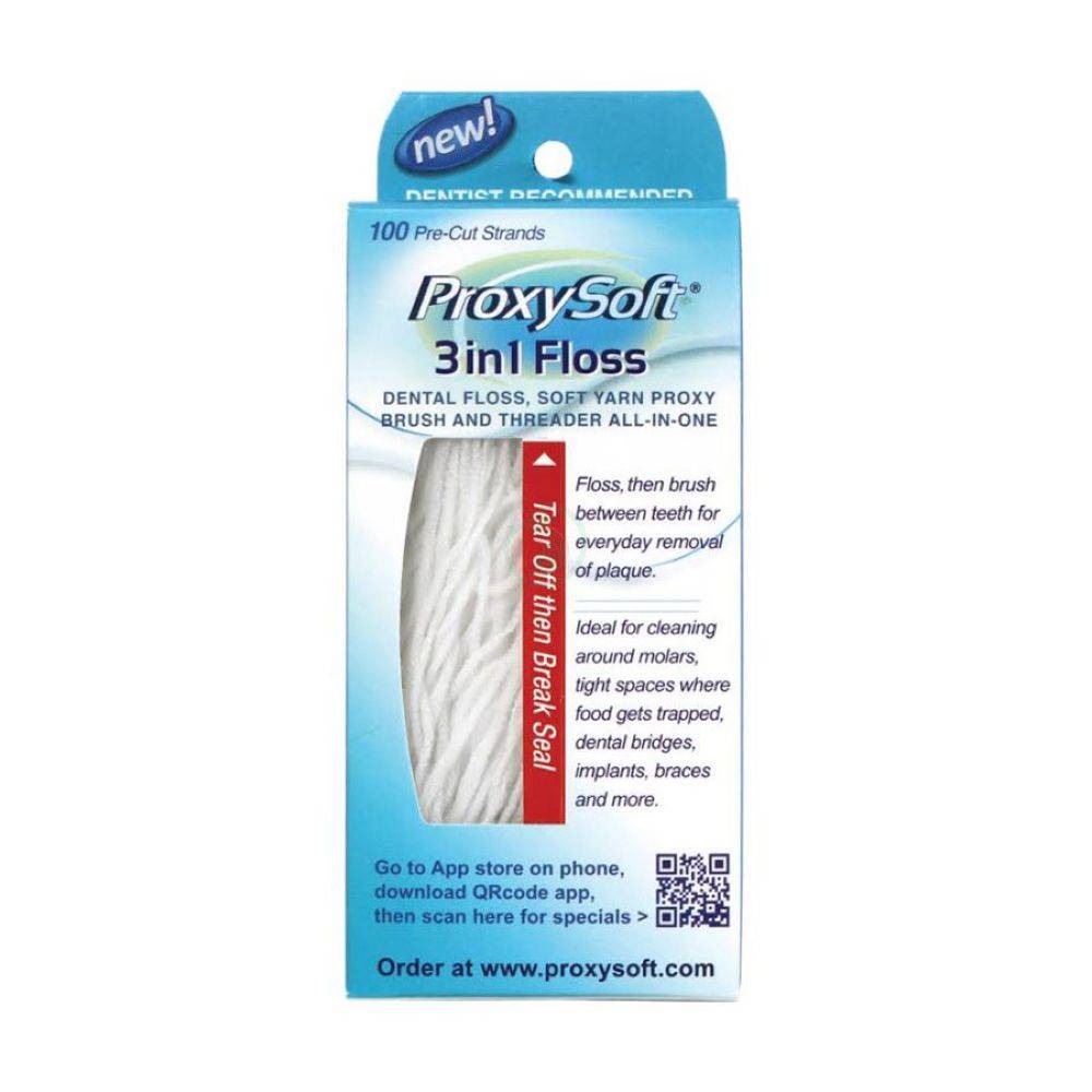 1. Čvrst plastičen vdevalec vodi nitko ProxySoft 3 v 1 med zobe, pod mostičke in sponke fiksnega ortodontskega aparata.