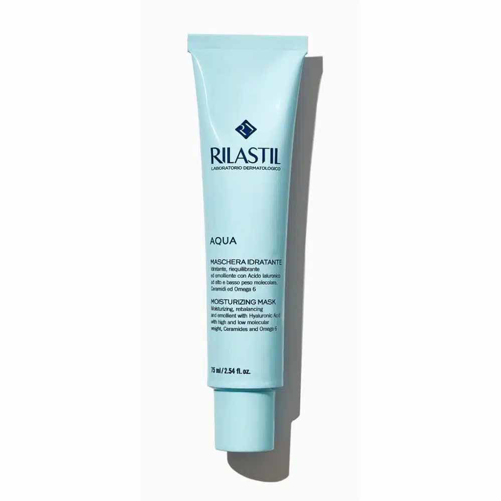 Rilastil Aqua vlažilna maska za obraz je lahka in kremasta nega, katere namen je obnoviti optimalno ravnovesje vlage v koži. Zahvaljujoč prisotnosti aktivnih sestavin ta maska takoj povrne hidracijo kože in hkrati pospeši celično obnovo. Poleg tega preprečuje tudi izgubo vode. Rezultat je gladka, napeta in sijoča koža, ki je vidno obnovljena. Rilastilova linija Aqua se osredotoča na zagotavljanje intenzivne vlage, ki pusti kožo svežo, napeto in gladko. To doseže z močjo pametnih formul s hialuronsko kislino z visoko in nizko molekulsko maso.