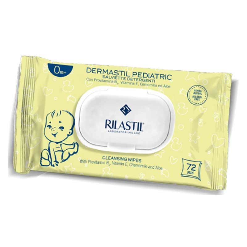 Rilastil Dermastil Pediatric robček za čiščenje in pomirjanje kože - mokri robčki s fiziološkim pH, deklarirani za čiščenje območja plenic dojenčkov in otrok.