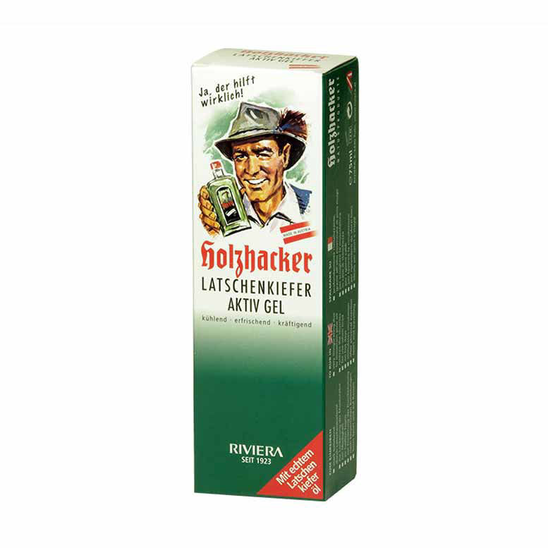 Riviera Holzhacker Latschenkiefer aktivni gel za mišice je izdelek, ki v svoji recepturi vključuje Holzhacker čistilni alkohol, ki pa mu je prav tako dodano olje gorskega bora. Riviera Holzhacker Latschenkiefer aktivni gel deluje posebej vitalizirajoče na mišice, saj je hladilen, osvežujoč ter poživljajoč. Ta posebna naravna formulacija vsebuje tudi izvleček arnike, mentol, kafro in pravi vinski destilat. Deluje za sprostitev mišic, v vročih dneh, za spodbujanje krvnega obtoka, po fizičnem stresu ter med športom in na potovanju.