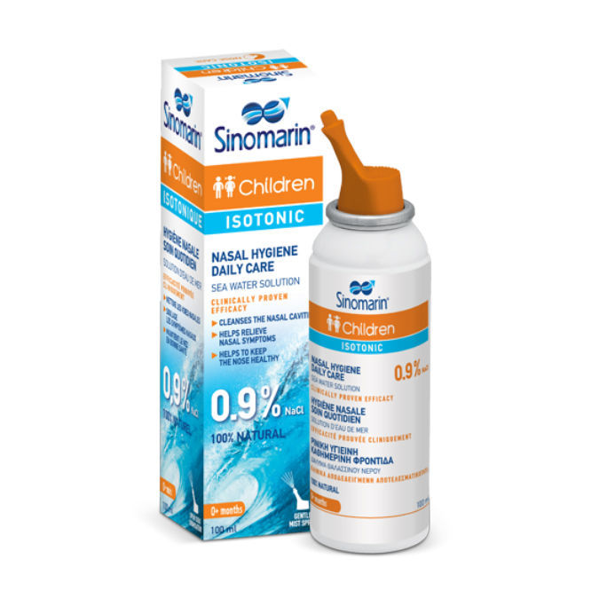 Sinomarin Isotonic 0,9% NaCl otroško izotonično pršilo za nos je medicinski pripomoček, ki učinkovito očisti nosno votlino, tako da izpere odvečno sluz in nečistote v sluzi, kot so patogeni, alergeni in škodljive snovi. Tako pripomore k nosnemu zdravju in preprečevanju nadaljnjega vnetja nosa, grla in žrela. Pomaga pri lajšanju simptomov zamašenega nosa in nosnega izcedka, ki se najpogosteje pojavita pri prehladu in alergijah, tako da izboljša prehodnost nosa in olajša dihanje skozenj. Poleg tega v suhem okolju vlaži nosno sluznico. Sinomarin Isotonic 0,9% NaCl otroško izotonično pršilo za nos se lahko uporabi samostojno ali skupaj z medicinskimi dekongestivi.