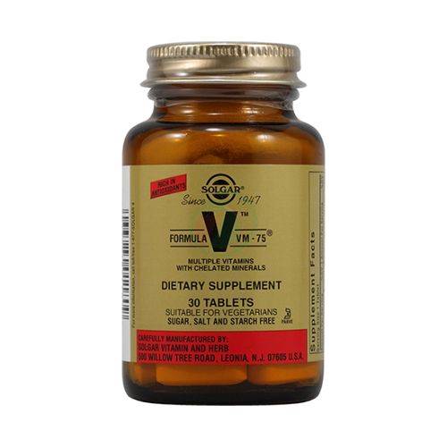 Solgar VM-75 multivitamini in mineralije izredno kompleksna formulacija aktivnih vitaminov in mineralnih snovi. Prehranski dodatek ima za osnovo normalno zeliščno bazo, ki je narejena iz sledečih sestavin: šipek, acerola, lucerna, vodne kreša, peteršilj in bioflavonoidnih komponent in to zgolj v eni smai tableti Solgar VM-75.