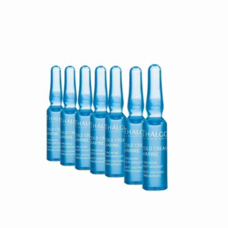 Thalgo Cold Cream Marine koncentrirani serum za obraz vsebuje visoko koncentracijo pomirjujočih biomimetičnih lipopeptidov in morsko nevrokozmetično inovacijo, ki pomaga ublažiti čezmerno sproščanje prenašalcev stresa in poveča tolerančni prag kože. Cold Cream kompleks olja morskih alg iz fitoplanktona neguje kožo z esencialnimi omega-3 maščobnimi kislinami, morski vosek krepi naravno obrambo kože, Sève Bleue pa je še posebej bogat z dragocenimi elementi v sledovih.