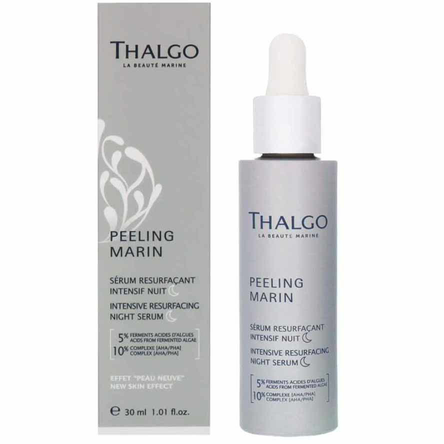 Thalgo Peeling Marin nočni serum za nežni piling kože vsebuje kisline iz fermentiranih mikroniziranih alg (3%) in (1,5%) AHA in PHA kompleks (iz glikolne in glukonske kisline), ki zagotavljata nežen mikro kislinski piling. Izdelek ustvari učinek zdrave sijoče kože z učinkom površinskega pilinga, ki je primeren za vse tipe kože in vsakodnevno uporabo brez, da bi kožo pri tem izsušil. Inovativni naravni biotehnološki proces fermentacije vodi do sproščanja več kalcija, železa in magnezija iz morskih alg.