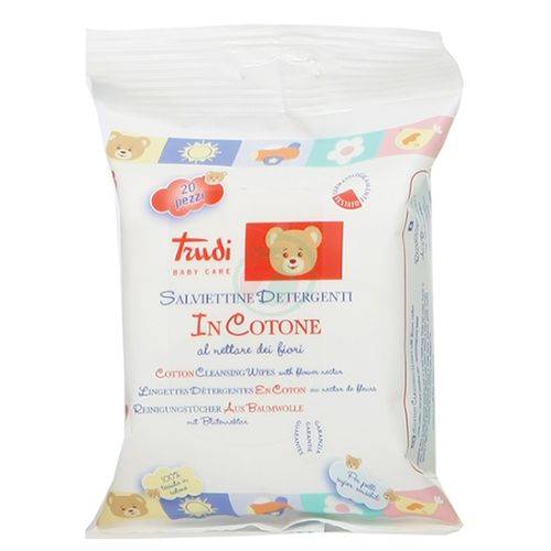 Trudi bombažni čistilni robčki so mokri robčki pakirani po 20 robčkov namenjeni vsakodnevnemu brezvodnemu čiščenju občutljive kože vašega otroka. Robčke lahko brez večje težave uporabite pri menjavi planičk ter čiščenju umazanije s površine dojenčkove kože.
