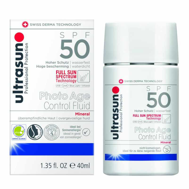 Ultrasun Photo Age Control mineralni fluid za zaščito pred soncem z zaščitnim faktorjem 50 je visoko učinkovit izdelek, zasnovan za zaščito kože pred škodljivimi UV-žarki in hkratno skrb za znake staranja. Ta mineralni fluid uporablja mineralne filtre za natančno zaščito pred UVB in UVA žarki, kar omogoča občutljivim tipom kože, da se zaščitijo brez kemijskih filtrov. Fluid ima lahko teksturo, hitro se vpija in ne pušča mastnega občutka, kar zagotavlja udobno nošenje skozi ves dan.