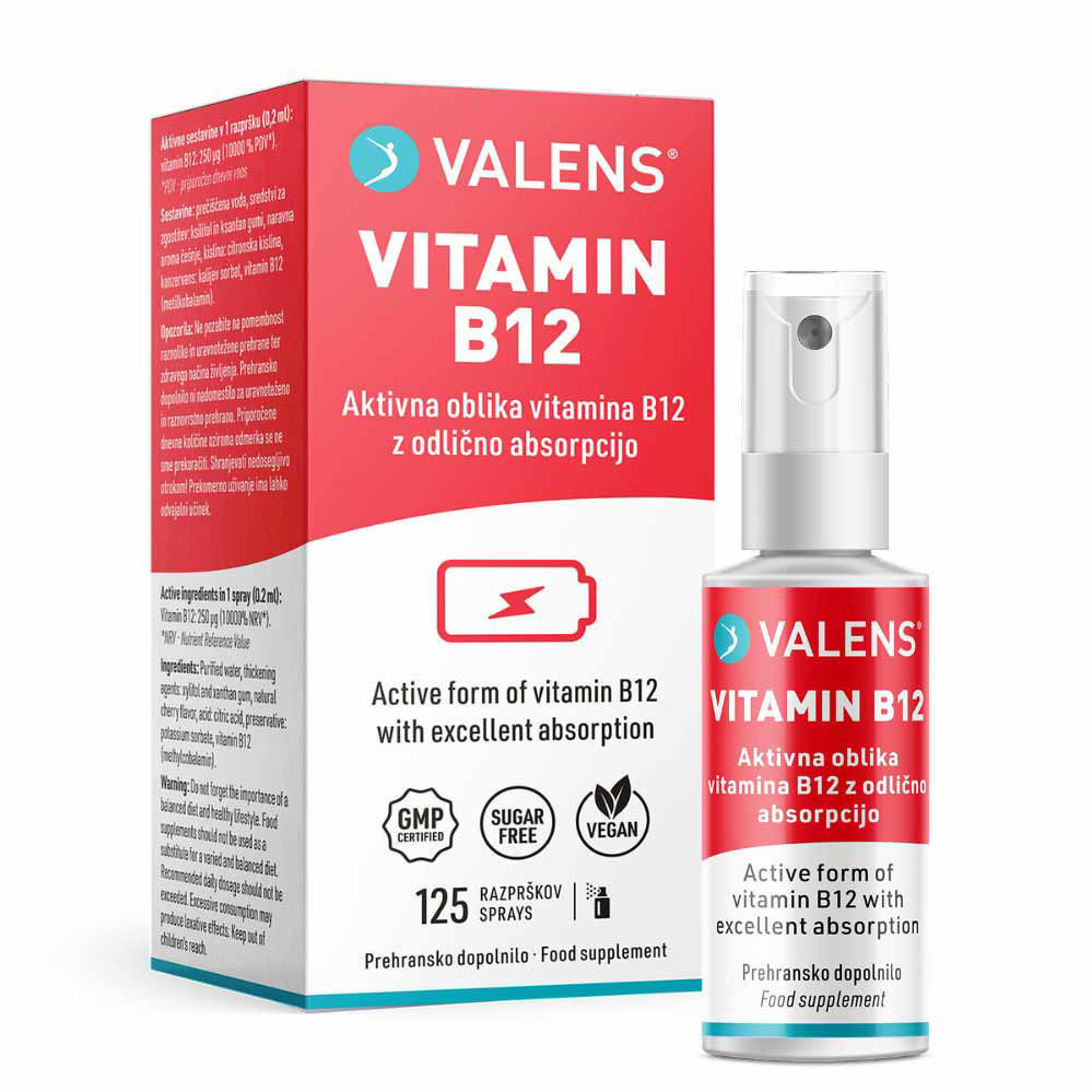 Prehransko dopolnilo Valens B12 vsebuje aktivno obliko vitamina B12 - metllkobalarnin, in sicer 250 mcg (10000% PDV*) v enem razpršku, Namenjeno je vsem, ki ne uživajo živil živalskega izvora in fermentiranih živil, ter v primeru oslabljene absorpcije v prebavnem traktu, še zlasti pri starejših, Vitamin B12 ima vlogo pri zmanjševanju utrujenosti in izčrpanosti, sproščanju energije pri presnovi, delovanju živčnega sistema, normalnem psihološkern delovanju in nastajanju rdečih krvničk.