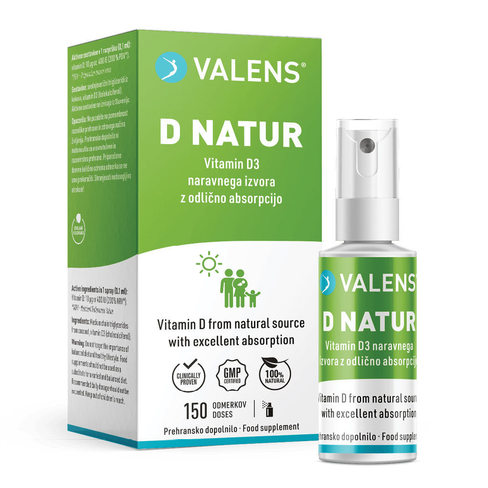 Valens D-natur pršilo vsebuje vitamin D3 naravnega izvora z odlično absorpcijo za uporabo otrokom in odraslim osebam - 100 % NARAVNO - BREZ KONZERVANSOV.