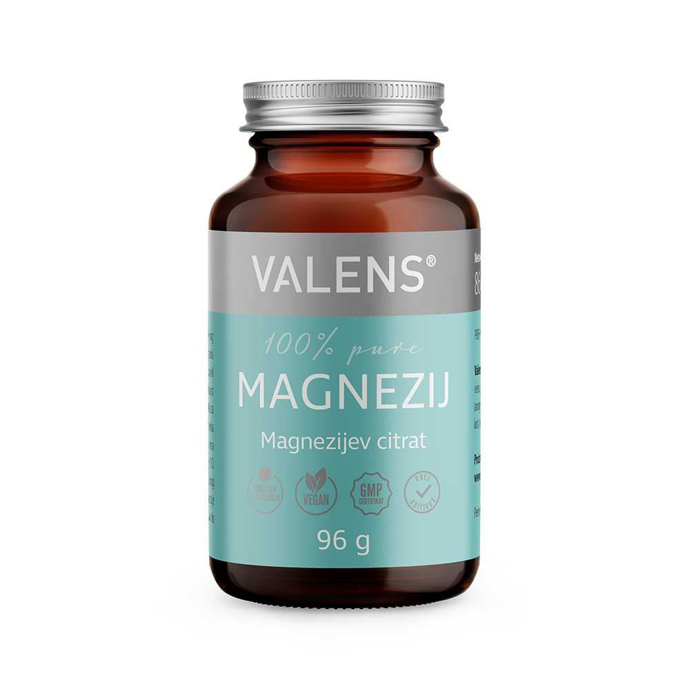 Prehransko dopolnilo v prahu Valens Magnezij vsebuje popolnoma čist magnezijev citrat. To je organska oblika magnezija, ki se bolje absorbira od anorganskih oblik. Valens Magnezij v prahu ne vsebuje drugih dodatkov.