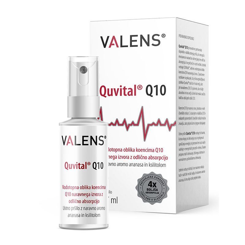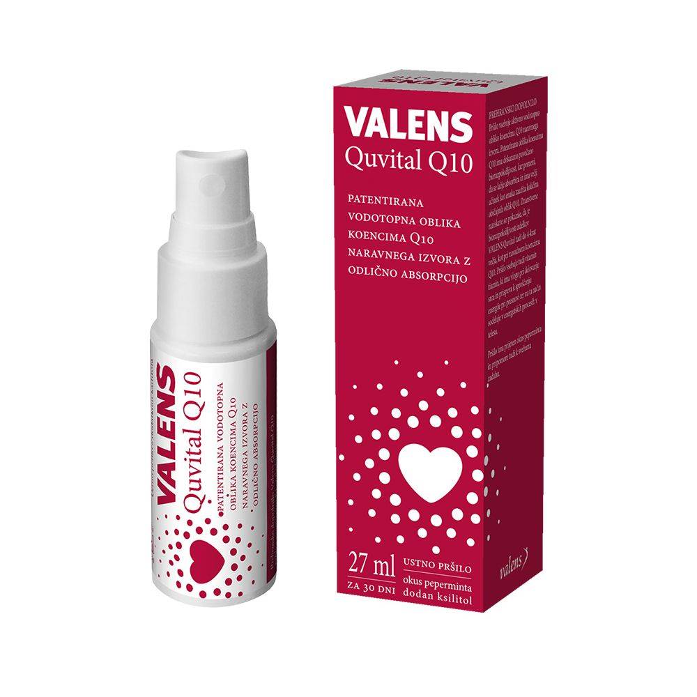 Prehransko dopolnilo Valens Quvital Q10 pršilo z vitaminom B1 ter s sladilom.