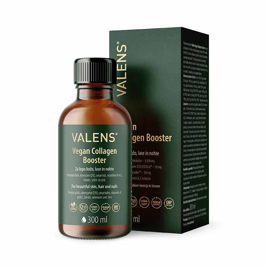 Prehransko dopolnilo, ki vsebuje veganski kolagen. To je Valens Vegan Collagen Booster tekočina omamno dobrega okusa po korenju ter limoni. Mnogi, ki uživajo vegansko hrano imajo težave z uživanjem dodatnega kolagena, ki bi dejansko učinkoval in bil hkrati še dobrega okusa. Novi Valens Vegan Collagen Booster v tekočini pa je prav to.