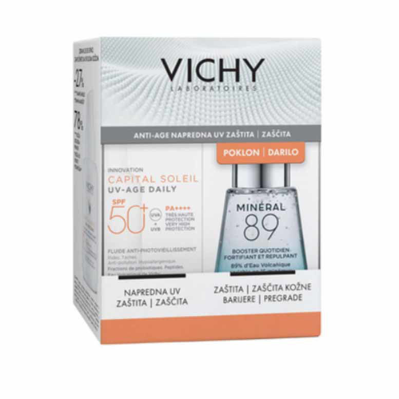 Vichy Capital Soleil paket za zaščito pred soncem vsebuje Vichy Capital Soleil UV-Age obarvan fluid za obraz ZF 50+ (40 ml) in Vichy Mineral 89 Booster vlažilni serum za obraz za vse tipe kože (30 ml). Vichy Capital Soleil paket za zaščito pred soncem se s svojima izdelkoma bori proti znakom fotostaranja in pomaga pri preprečevanju gub, temnih lis in oksidativnega stresa, ki so posledica UV-sevanja in onesnaženja. Dermatologi po vsem svetu svetujejo Mineral 89, ki je preizkušen na več kot 3800 pacientih obeh spolov z vsemi tipi kože.
