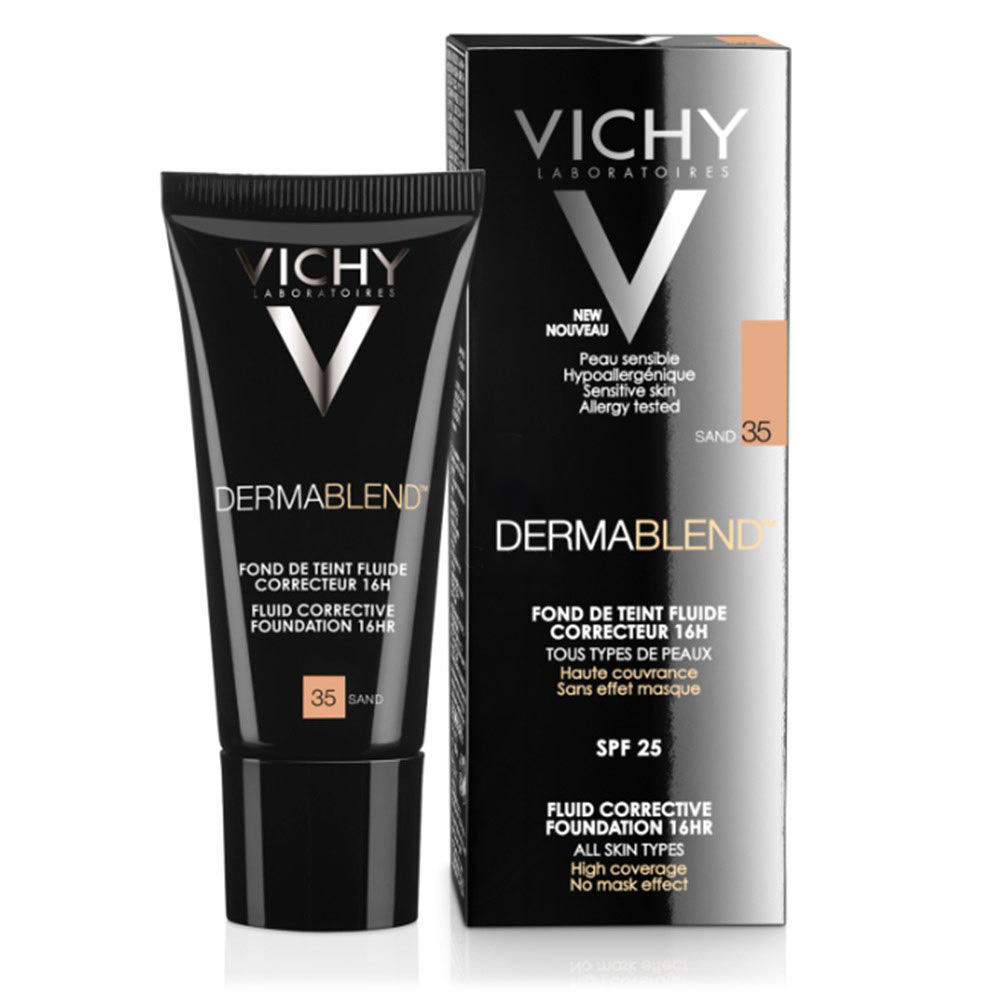 Vichy Dermablend korektivna podlaga je tekoči puder z izjemno prekrivnostjo z dolgo obstojnostjo.