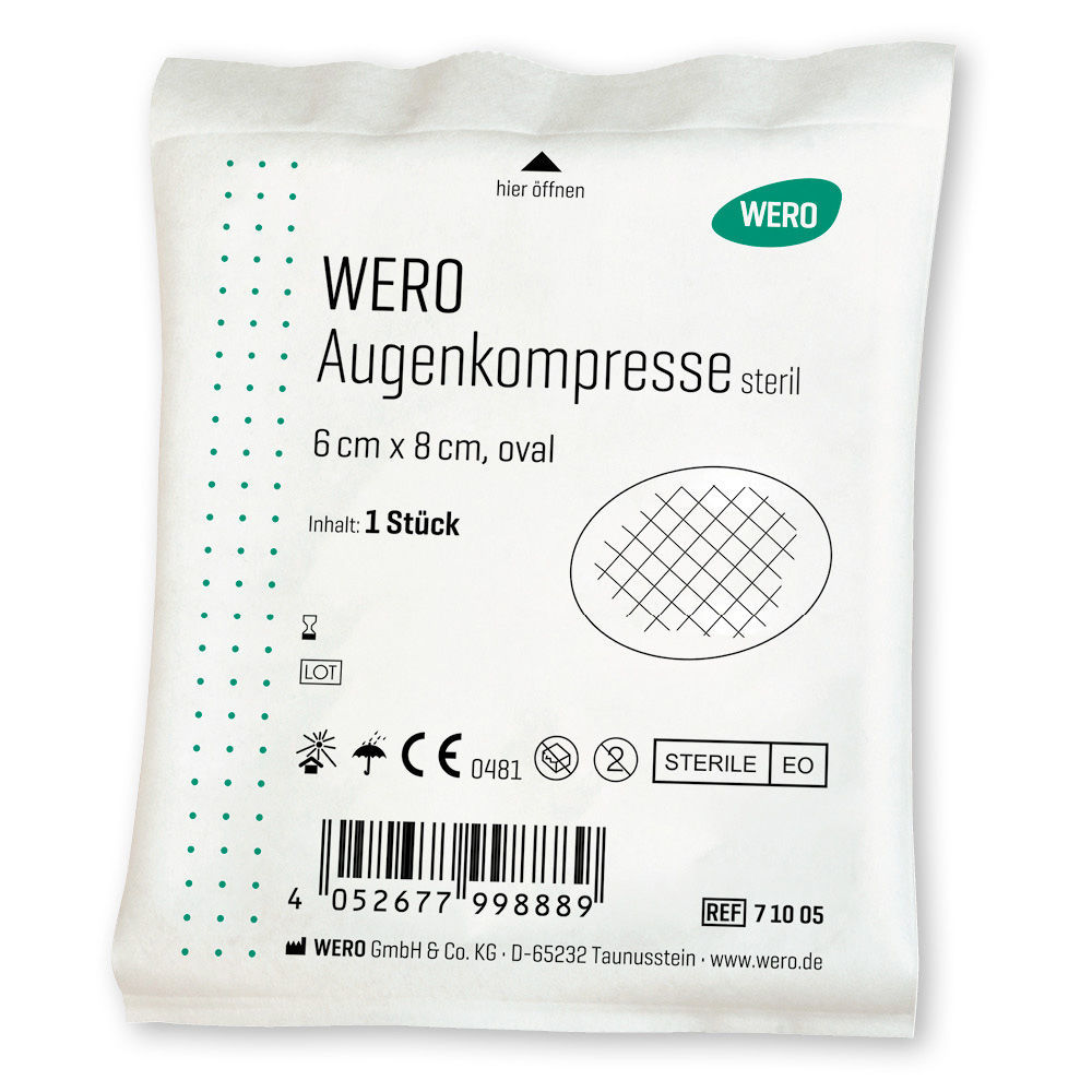 Komprese za oko so namenjene pokrivanju očes, da jih zavarujemo ob nastali zunanji poškodbi. Wero očesna kompresa ima posebno ovalno obliko in je velika 6 cm x 8 cm. Se popolnoma prilagodi očesu in mu nudi zaščito. Okrevanje poškodovanega očesa se lahko deloma izboljša, če oko ni izpostavljeno draženju zaradi snovi v okolju ali premočne sončne svetlobe.