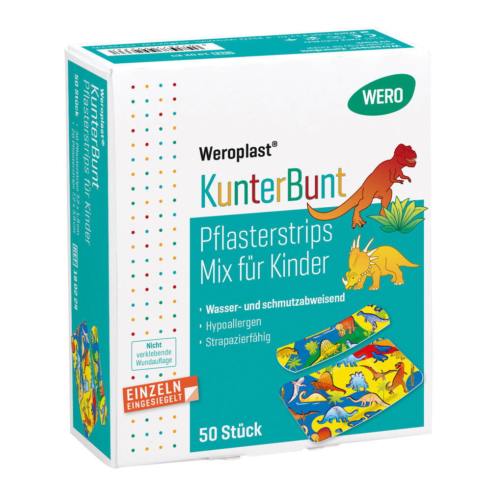 Weroplast KunterBunt otroški obliži za rane so izjemno prikupni s pisanimi motivi dinozavrov in nudijo zračnost koži pod obližem.