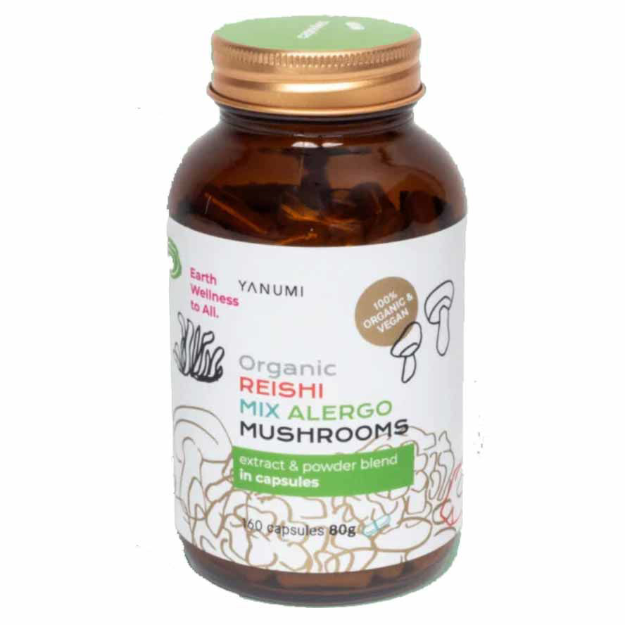 Medicinske gobe, ki jih vsebuje mešanica Yanumi Alergo Mix vključuje: Agaricus blazei (blazejev kukmak), Hericium erinaceus (resasti bradovec), Grifola frondosa (maitake) in Ganoderma Lucidum (Svetlikava pološčenka). Pri učinkovanju medicinskih gob in izbiri prehranskega dopolnila z njihovo vsebnostjo imata pomembno vlogo kakovost surovin in njihova sestava, zato je bilo tekom ustvarjanja to glavno vodilo. Gobe v mešanici Alergo Mix so tako izključno slovenskega porekla in plod raziskav slovenskih znanstvenikov.