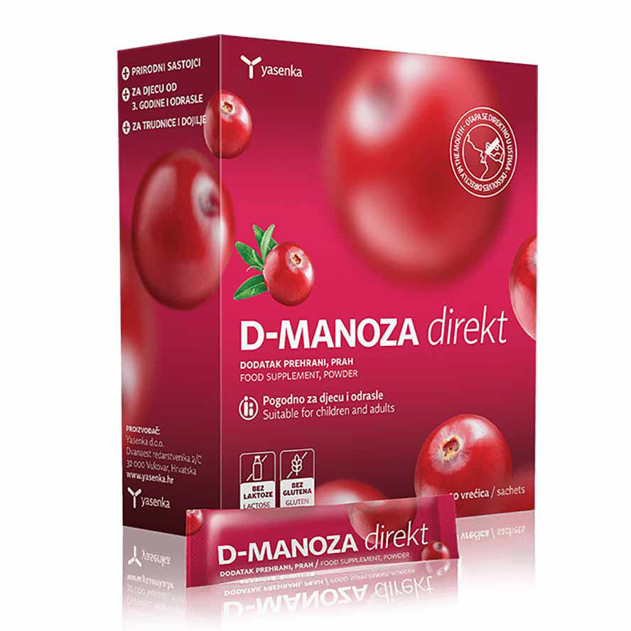 Yasenka D-Manoza Direkt je prehranskod opolnilo, ki deluje kot hitra in učinkovita pomoč že ob prvih znakih neugodja pri mehurju. Prehransko dopolnilo Yasenka D-Manoza Direkt se odlično obnese za uporabo pri antibiotični terapiji in ga lahko pijejo otroci že od 3. leta dalje in odrasli. Praktična embalaža za neposredno uporabo v ustih. Varno za uporabo pri nosečnicah in doječih ženskah.