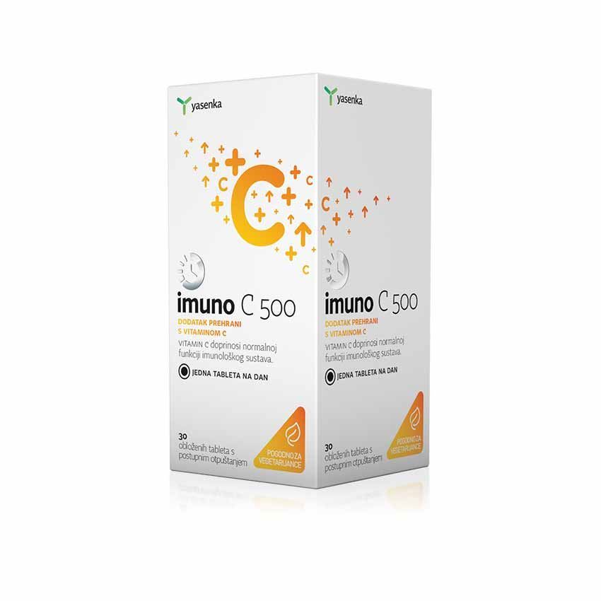 Ena Imuno C 500 obložena tableta s podaljšanim sproščanjem vsebuje 500mg vitamina C. Tableta s podaljšanim sproščanjem je posebej prilagojena z namenom, da se vitamin C sprošča skozi časovno obdobje do nekoliko ur, ki prispeva k boljši absorpciji in daljši oskrbi organizma z vitaminom C. Vitamin C prispeva k normalni funkciji imunskega sistema in ščiti celice od oksidativnega stresa. Poleg tega ima tudi vlogo v normalnem metabolizmu sproščanja energije in zmanjšaju utrujenosti in izčrpanosti. Vitamin C poveča absorpcijo železa in prispeva k normalni tvorbi kolagena, ki je potreben za normalno funkcijo kosti, hrustanca, dlesni, zob, kože in krvnih žil.