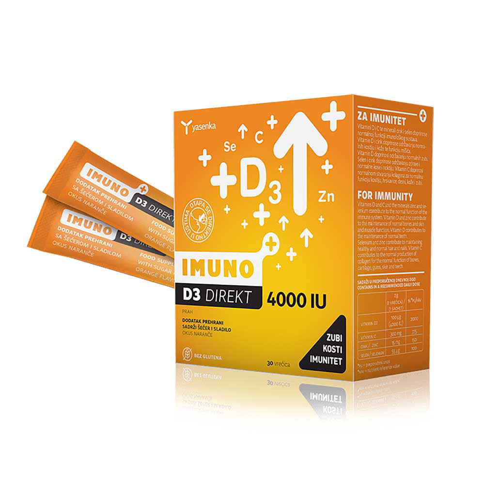 Yasenka Imuno D3 direkt, 4000 IU je učinkovito prehransko dopolnilo v vrečicah, ki vsebuje izredno pomemben D vitamin ter tudi cink in selen ter vitamin C.