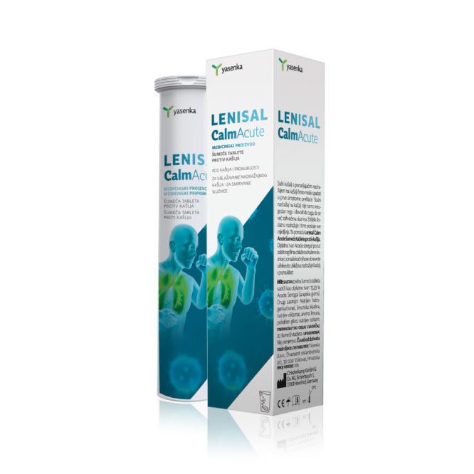 Yasenka Lenisal CalmAcute šumeče tablete vsebujejo Acacia senegal, ki tvori zaščitni film in obloži razdraženo sluznico, kar pomaga pri njeni obnovi in regeneraciji. Ta naravna sestavina hitro in učinkovito blaži dražeč kašelj, zmanjšuje pogostost kašlja ter hripavost. Izdelek je brez sladkorja in glutena, zato je primeren tudi za tiste z občutljivostjo ali posebnostmi prehrane. Tablete se raztopijo v kozarcu vode, nato se pijejo po požirkih, pri čemer je priporočena čim daljša izpostavljenost raztopine v grlu za boljši učinek. Priporočajo se za zaustavljanje suhega dražečega kašlja, pomirjanje razdražene in poškodovane sluznice grla ter pri hripavosti in poškodbah glasilk.