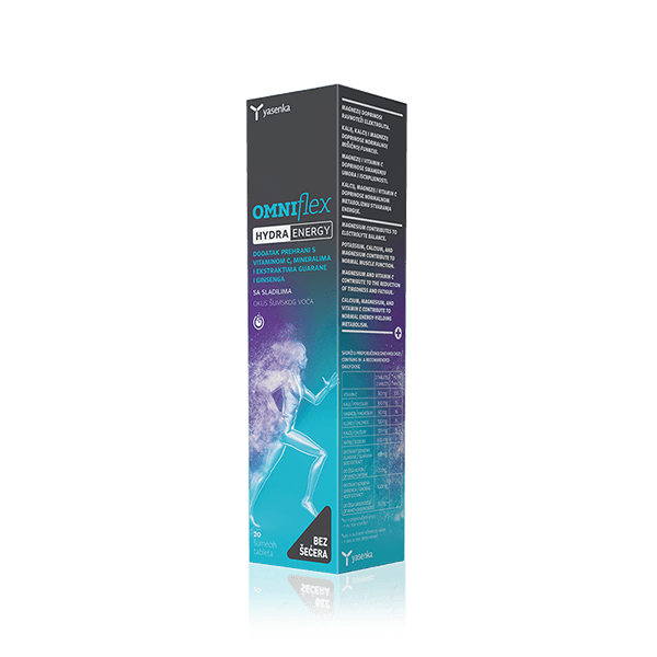 Yasenka Omniflex Hydra Energy prehransko dopolnilo v obliki šumečih tablet, je edinstven dodatek k vaši vsakdanji oskrbi telesa. Z okusom gozdnih sadežev, visoko vsebnostjo vitamina C in ključnih mineralov ter izvlečkoma guarane in ginsenga, je namenjeno vsem, ki si želijo podpreti svoj imunski sistem in svoje dragoceno telo zaščititi pred zunanjimi dejavniki. Z rednim uživanjem Yasenka Omniflex Hydra Energy prehranskega dopolnila, boste pozitivno vplivali tudi na vašo fizično in mentalno vitalnost.