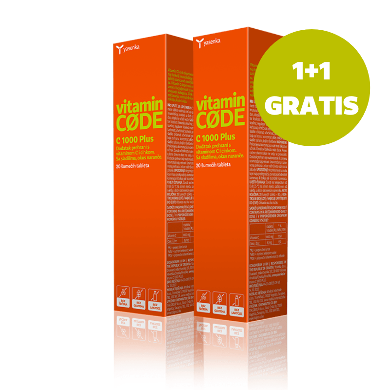 Ena šumeča tableta Yasenka Vitamin Code C 1000 Plus vsebuje 1000 mg vitamina C in 15 mg cinka. Vitamin C in cink skupaj prispevata k normalni funkciji imunskega sistema in ščitita celice pred oksidativnim stresom. Vitamin C prispeva k zmanjšanju utrujenosti in izčrpanosti ter normalni tvrobi kolagena. Prav tako pripomore k izboljšanju absorpcije železa. Yasenka Vitamin Code C 1000 šumeče tablete ne vsebujejo sladkorja. Cink prispeva k vzdrževanju normalnih kosti, kože, nohtov las in vida.